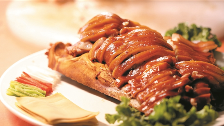 剛出鍋的扒豬臉散發(fā)著紅亮的光澤。