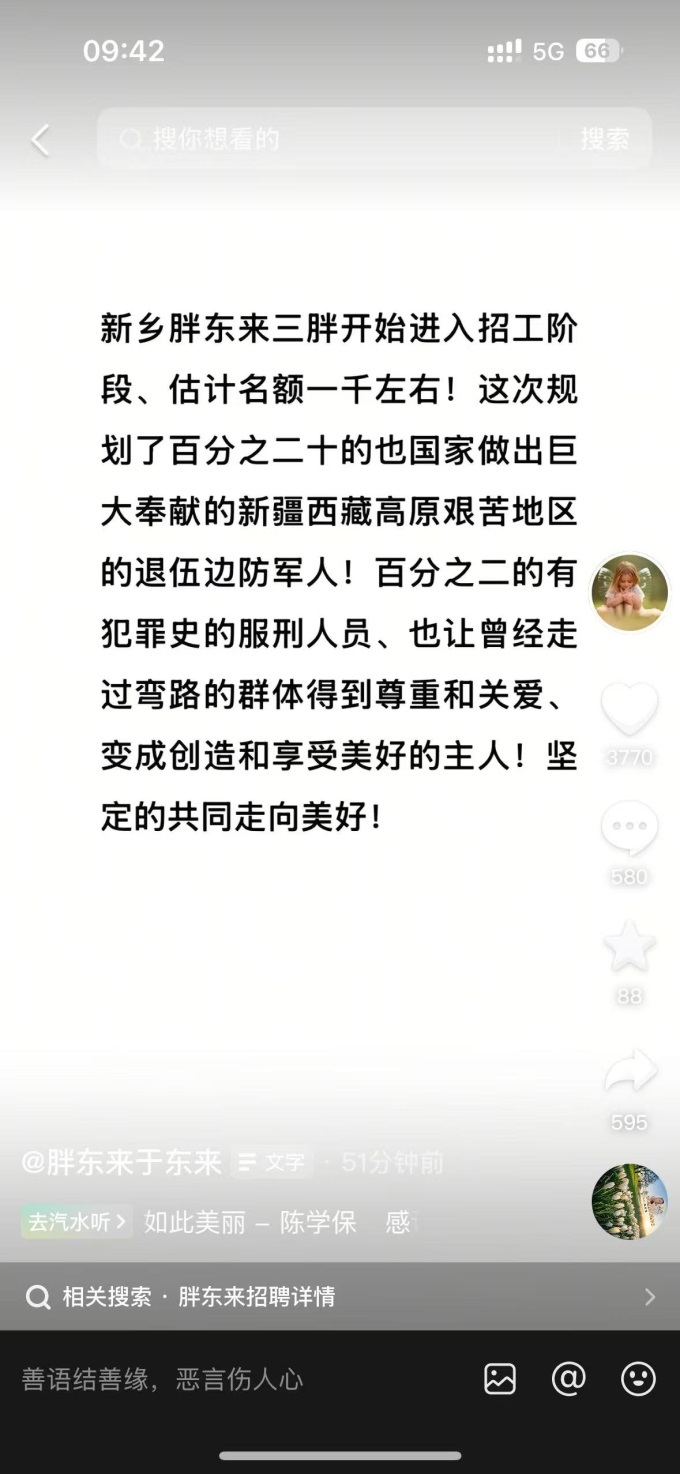東來哥表示,此次招聘規(guī)劃了20%的名額給為國家做出巨大奉獻的新疆西藏高原艱苦地區(qū)的退伍邊防軍人;2%的名額給有犯罪史的服刑人員,讓曾經(jīng)走過彎路的群體得到尊重和關(guān)愛,成為創(chuàng)造和享受美好的主人。