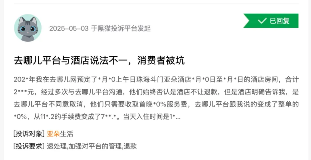 此外,黑貓投訴上“亞朵酒店”相關投訴超千條,關鍵詞多為噪音、衛(wèi)生差、不給退款、隱私泄露等。
