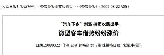 據(jù)《齊魯晚報(bào)》報(bào)道,2009年3月,“汽車下鄉(xiāng)”補(bǔ)貼細(xì)則出臺,濟(jì)南農(nóng)民老井很高興,盼了一個(gè)多月的五菱之光終于能買了。但到汽車銷售處一看,他失望了?!艾F(xiàn)在五菱之光立業(yè)型的標(biāo)價(jià)是3.35萬元,經(jīng)銷商說之前那款2.98萬元的沒貨了。”老井不甘心,微型客車按國家規(guī)定補(bǔ)貼10%,可現(xiàn)在漲價(jià)后,相當(dāng)于沒了補(bǔ)貼,這不是空歡喜一場嗎?