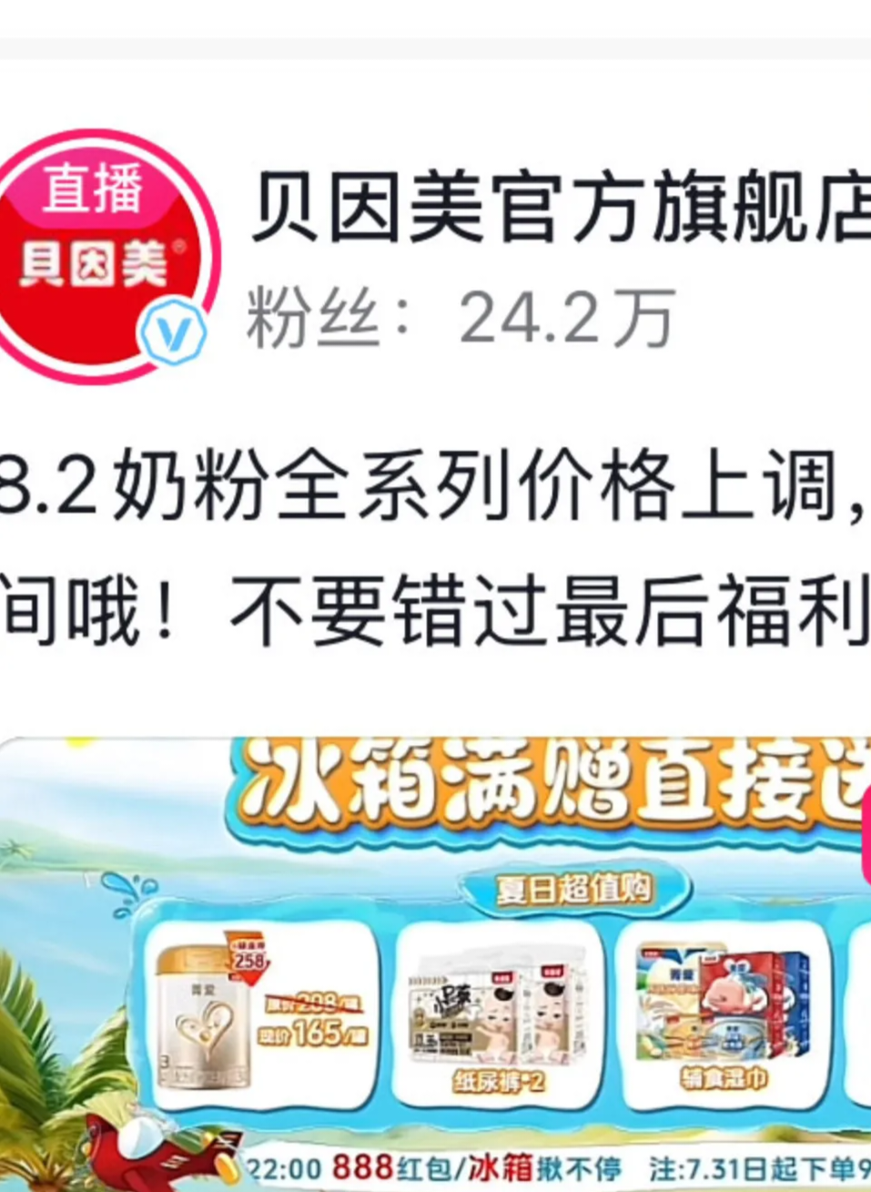 “漲價(jià)”傳聞并非毫無根據(jù),貝因美官方旗艦店曾宣傳“8.2奶粉全系列價(jià)格上調(diào),還沒囤貨的寶媽抓緊時(shí)間,不要錯(cuò)過最后福利”,但在3日的直播間又改口稱“貝因美所有品項(xiàng)都沒有漲價(jià),請勿信謠不傳謠”。