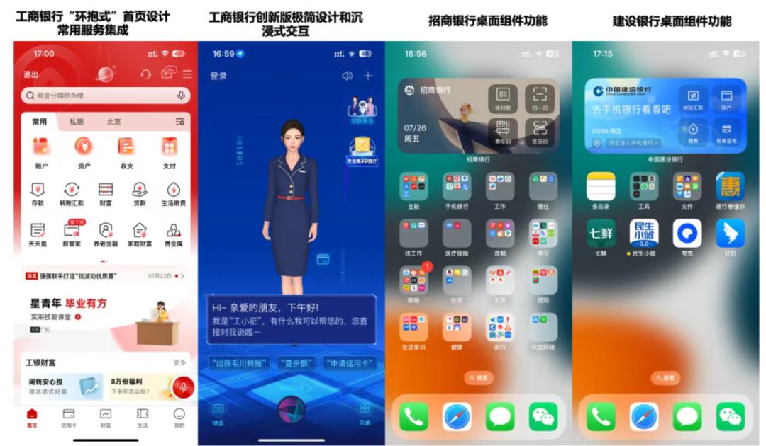 如工商銀行9.0版本首創(chuàng)“環(huán)抱式”首頁(yè),集成常用服務(wù),實(shí)現(xiàn)一鍵直達(dá),創(chuàng)新版采用極簡(jiǎn)設(shè)計(jì)、沉浸交互;招商銀行App的iOS桌面組件新增支持掃一掃、收付款、乘車碼、醫(yī)保碼,一點(diǎn)即達(dá)。