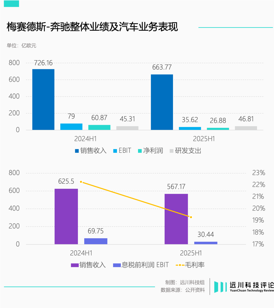 奔馳業(yè)績(jī)更令人擔(dān)憂,上半年收入同比下滑8.59%,息稅前利潤(rùn)直接減半。與巔峰時(shí)期單季40億歐元的盈利相比,二季度凈利潤(rùn)僅9.6億歐元。單看汽車業(yè)務(wù),營(yíng)收同比下降11.1%,息稅前利潤(rùn)下滑超70%。