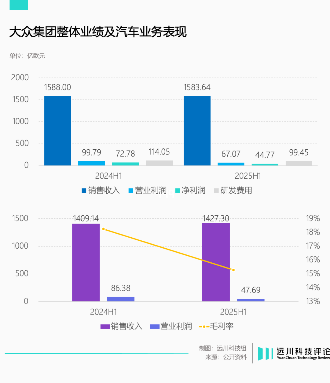 大眾集團(tuán)今年上半年收入1583.6億歐元,與去年同期相比下滑不到1%,交付量440萬(wàn),同比小幅增長(zhǎng)1%,但營(yíng)業(yè)利潤(rùn)同比下降32.79%,盈利能力明顯減弱。
