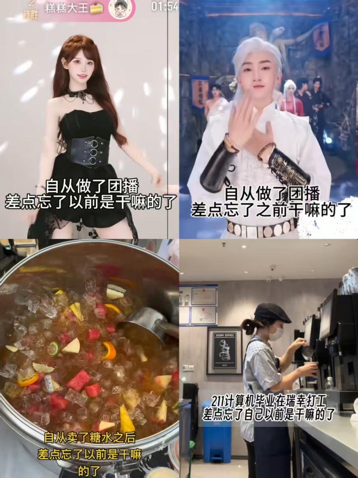 于燼說不反對做團播,經(jīng)濟下行時娛樂行業(yè)能掙錢就可以嘗試,即便做不長,也能完成經(jīng)濟積累?!安铧c忘記以前是干嘛的”系列視頻不僅是內(nèi)容創(chuàng)作,還讓不少博主漲粉。當“經(jīng)濟上行讀985”的觀念遭遇“經(jīng)濟下行做團播”的現(xiàn)實,年輕一代并非簡單的“道心破碎”,而是在巨大壓力下進行價值重構(gòu)和生存實驗。在問“畢業(yè)可以不成功嗎”之前,要明白“成功”和“價值”已被重新定義。好工作的定義變?yōu)槟鼙U仙妗崿F(xiàn)身心自由和自身價值積累。無論投身團播、送外賣還是直播,都是人們對抗經(jīng)濟寒冬的方式,破碎的“道心”用時薪重塑。既然無法改變時代,結(jié)合、接受和利用現(xiàn)實重新出發(fā)更為重要。在“差點忘了”系列視頻中,沒人真正忘記過去。