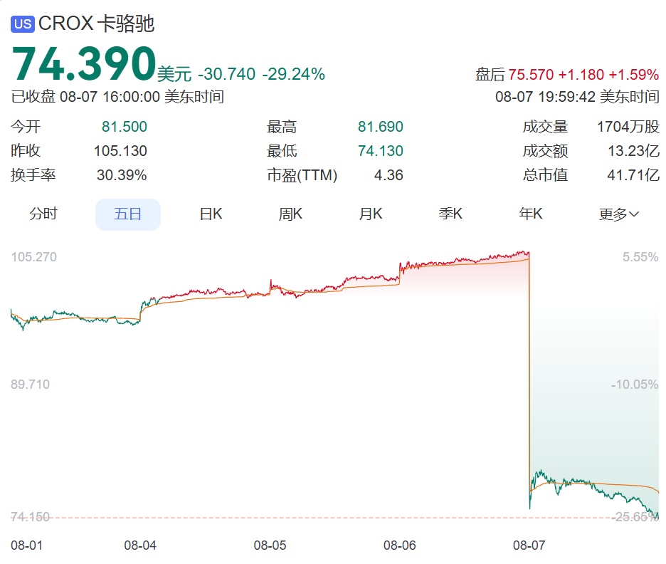 受此消息影響,Crocs股價(jià)一夜之間暴跌近30%,報(bào)收74.39美元,觸及近三年來的最低點(diǎn),也是其近十多年來最大單日股價(jià)跌幅,總市值僅剩41.71億美元。