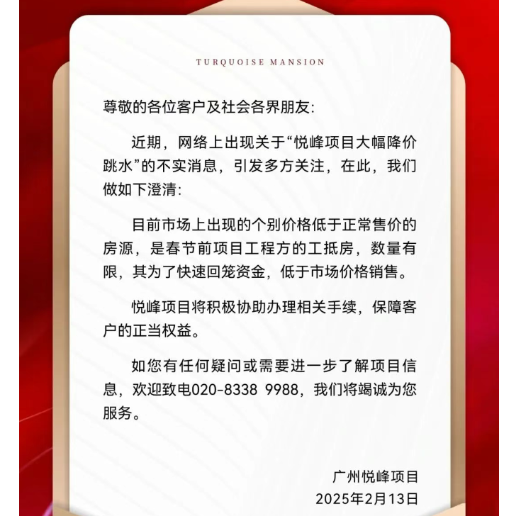 消息稱,廣州悅峰因降價被地方有關(guān)部門約談。隨后,房價回調(diào)到1萬元/㎡,開發(fā)商聲明“個別低價房是春節(jié)前項目工程方的工抵房,數(shù)量有限,為快速回籠資金”。