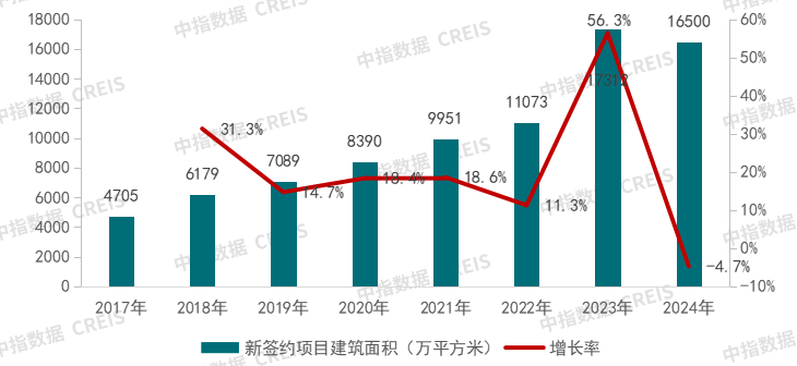 中指研究院數(shù)據(jù)顯示,2022 - 2024年,房地產(chǎn)代建新簽約項目規(guī)劃建筑面積分別為11,073萬㎡、17,312萬㎡和16,500萬㎡,市場集中度持續(xù)高位,前五企業(yè)市場份額占比分別為58.6%、49.8%和54%。