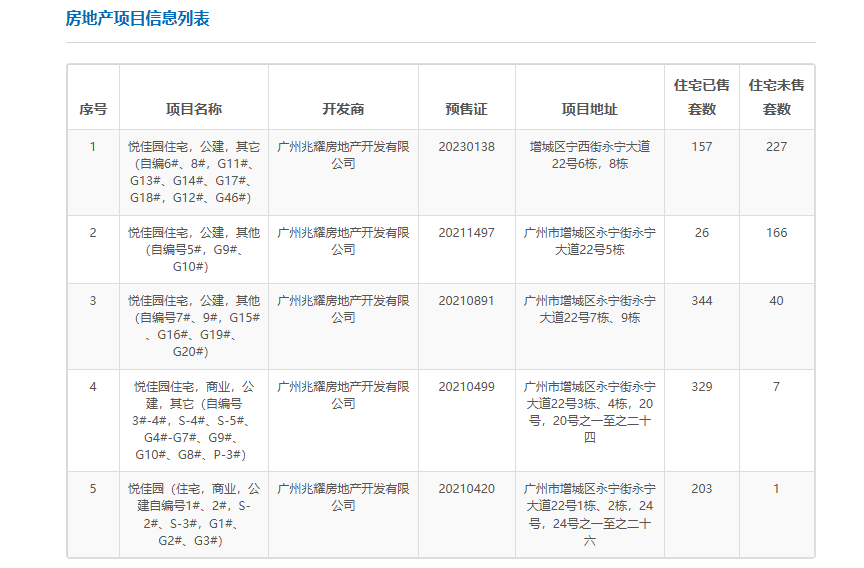 廣州悅峰實現(xiàn)超70%去化率花了4年多時間,最早2021年4月拿預售證,最近一次是2023年1月,6棟、8棟合計384套房源,目前去化率為40.9%。