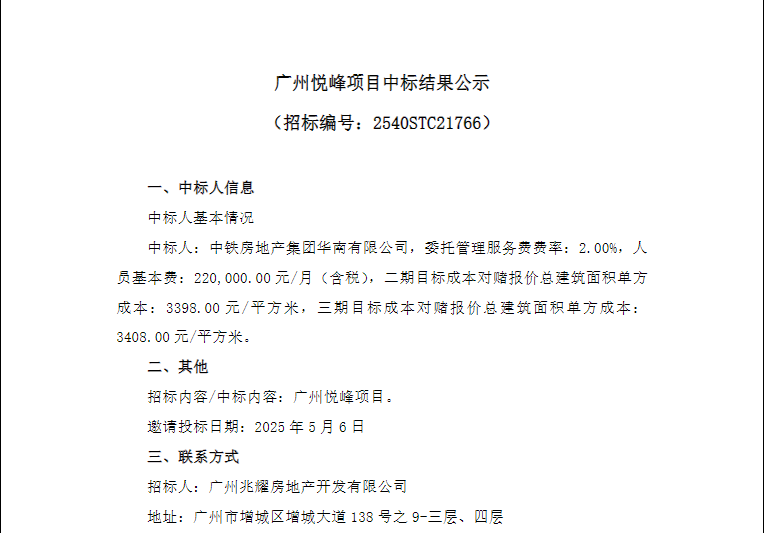 源媒匯查詢得知,中鐵房地產(chǎn)集團華南有限公司中標廣州悅峰二、三期項目,項目委托管理服務費率2%,二期、三期目標成本對賭報價總建筑面積單方成本分別為3398元、3408元/㎡。