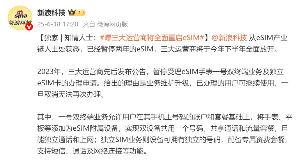 微博,獨(dú)家 | 知情人士:曝三大運(yùn)營商將全面重啟eSIM
