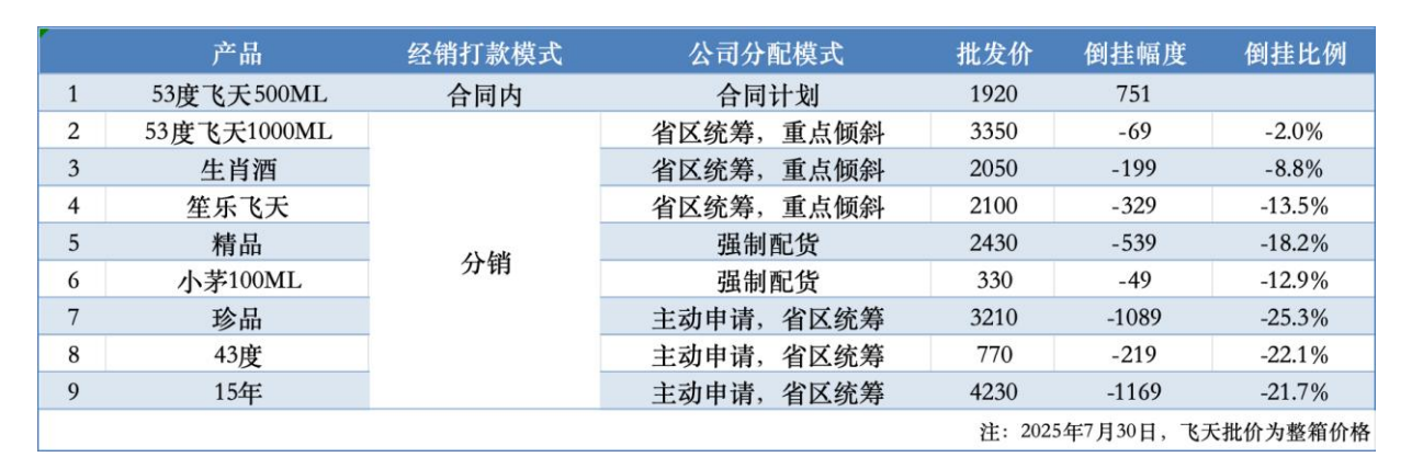 即使是白酒行業(yè)實(shí)力最強(qiáng)的貴州茅臺(tái)(600519.SH)也面臨不小的市場(chǎng)壓力。目前,貴州茅臺(tái)旗下除普茅(53度、500ml飛天茅臺(tái))外,其他非標(biāo)產(chǎn)品價(jià)格普遍已倒掛。信達(dá)證券研報(bào)顯示,截至7月底,珍品茅臺(tái)、43度茅臺(tái)、茅臺(tái)15年等產(chǎn)品倒掛程度均在20%以上,而生肖茅臺(tái)、精品茅臺(tái)、100ml小茅臺(tái)倒掛程度在8.8% - 18.2%;公斤茅臺(tái)倒掛程度相對(duì)較小,只有2%。而這些非標(biāo)產(chǎn)品在貴州茅臺(tái)體系中的“份量”不小,年銷(xiāo)售額動(dòng)輒數(shù)十億元乃至上百億元。