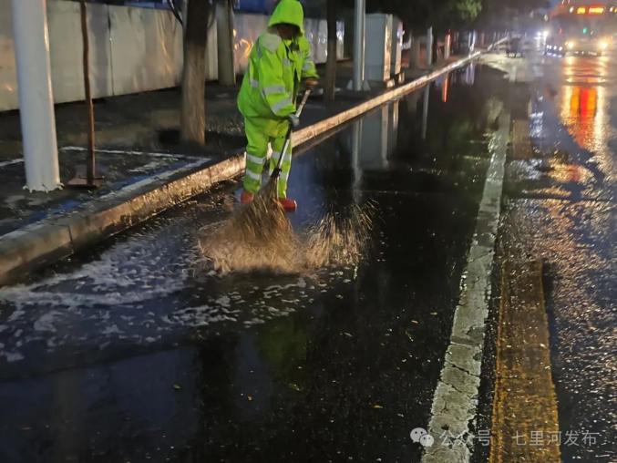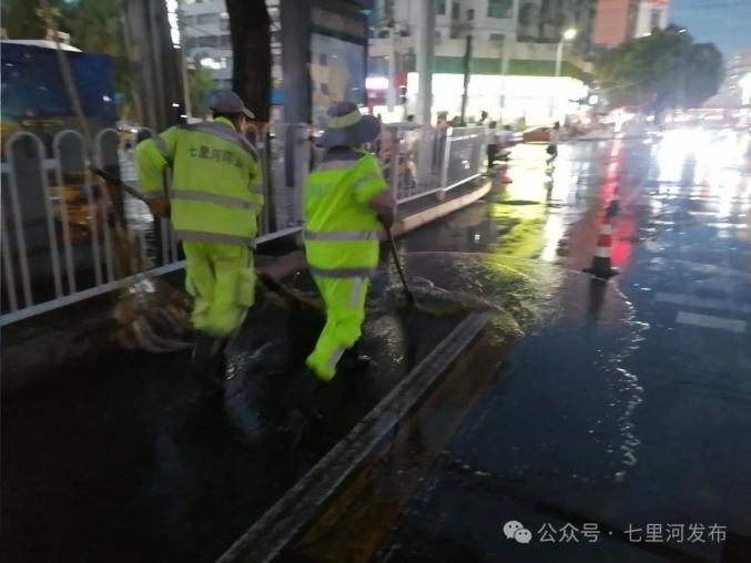降雨期間,1590人次的環(huán)衛(wèi)工人冒雨工作,他們手持掃帚、推板等工具,逐街逐巷進(jìn)行推水作業(yè),將積水快速引向排水口,還對(duì)排水口周邊雜物進(jìn)行精細(xì)清理,以提高排水效率。