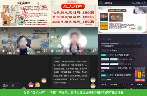 虛假/夸大宣傳封建迷信誘導(dǎo)消費(fèi):偽裝“國學(xué)大師”“專家”等名號,宣傳“玄學(xué)”等迷信內(nèi)容,以“逆天改命”“消災(zāi)治病”為噱頭,誘導(dǎo)用戶購買高價保健品、療愈課程等。