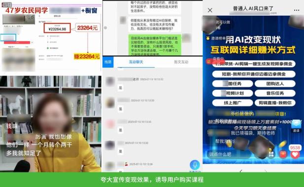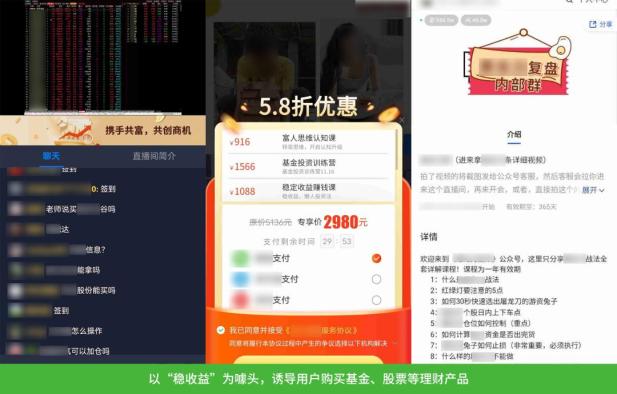 虛假/夸大宣傳變現(xiàn)產(chǎn)品:以“無門檻、輕松賺錢、月入過萬”為噱頭,誘導(dǎo)用戶購買課程;以“穩(wěn)收益”為噱頭,誘導(dǎo)用戶購買基金、股票等理財產(chǎn)品。