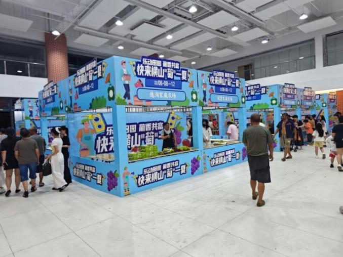 活動(dòng)現(xiàn)場(chǎng),“樂(lè)動(dòng)田園 葡香共富”集市十分熱鬧。在現(xiàn)代化的葡萄農(nóng)事服務(wù)中心大廳,展示了來(lái)自浦江15個(gè)鄉(xiāng)鎮(zhèn)(街道)的共富特產(chǎn)、非遺產(chǎn)品以及黃宅明星企業(yè)的特色產(chǎn)品,眾多游客駐足觀賞、品嘗和購(gòu)買,現(xiàn)場(chǎng)熱鬧非凡。