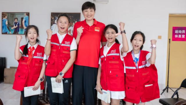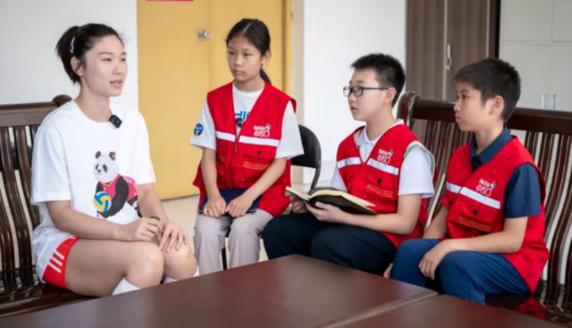 中國女排自由人王夢潔接受了采訪。她身穿印有熊貓打排球圖案的白色T恤和紅色短褲,孩子們拿著筆記本專注聆聽并記錄她的回答,場面溫馨而專注。