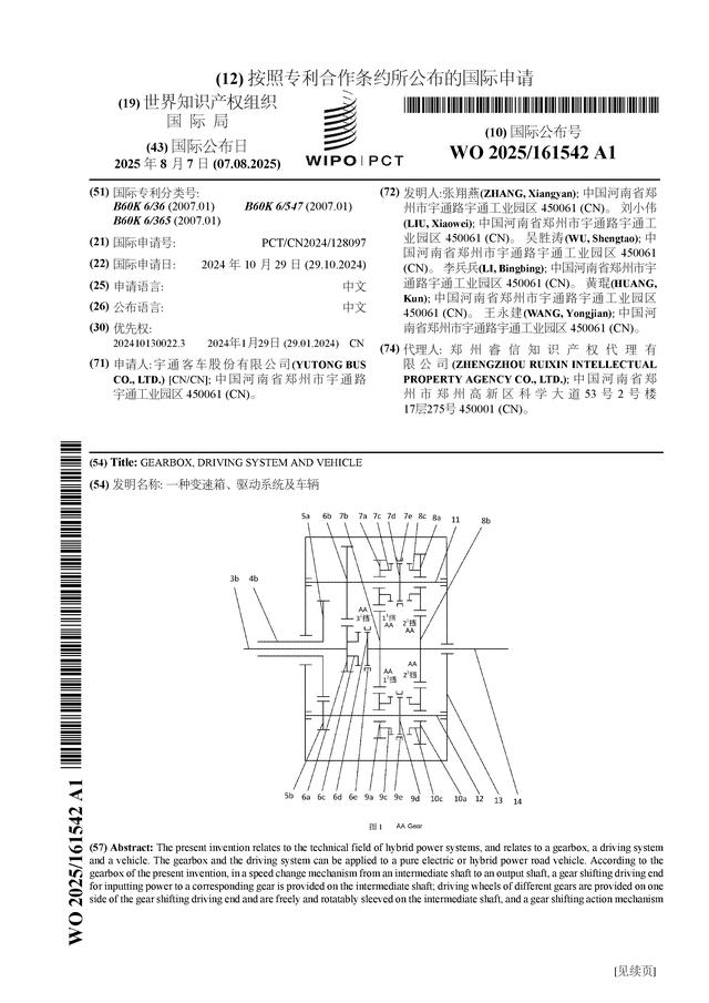 宇通客車公布“一種變速箱、驅(qū)動系統(tǒng)及車輛”國際專利申請