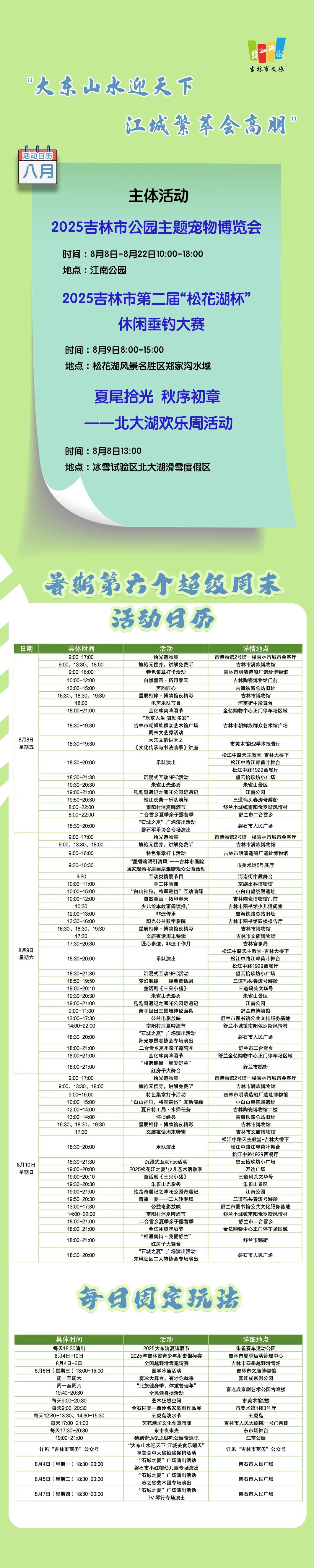1. 8月8日至22日,江南公園將舉辦“萌寵總動(dòng)員——2025吉林市公園主題寵物博覽會(huì)”。這里首創(chuàng)“公園沉浸式生態(tài)體驗(yàn)”模式,以5萬(wàn)平方米自然園林為畫布,融合20個(gè)主題展區(qū),通過(guò)“自然 + 互動(dòng)”形態(tài),讓大家在綠意中與愛寵共度美好時(shí)光。