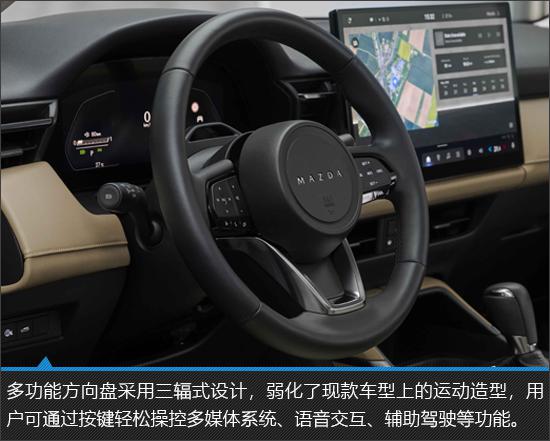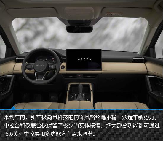 與現款車型相比,新車內飾更側重于營造一個舒適愜意的家庭用車環(huán)境。尺寸更大的15.6英寸中控屏內置MAZDA CONNECT智聯系統(tǒng),科技感更強。同時,儀表臺和座椅多采用軟質材料包裹,營造出高級感。而且,得益于更長的軸距,多人出行時后排乘客的腿部空間更加寬裕。