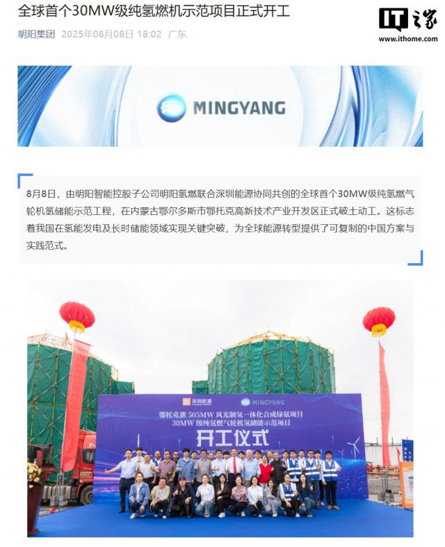 IT之家8月9日消息,“明陽集團”官方公眾號發(fā)布博文,報道稱內(nèi)蒙古鄂爾多斯市鄂托克高新技術(shù)產(chǎn)業(yè)開發(fā)區(qū)于昨日(8月8日)啟動全球首個30MW級純氫燃氣輪機氫儲能示范工程,標志著我國在氫能發(fā)電及長時儲能領(lǐng)域取得關(guān)鍵突破。