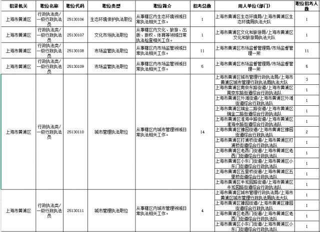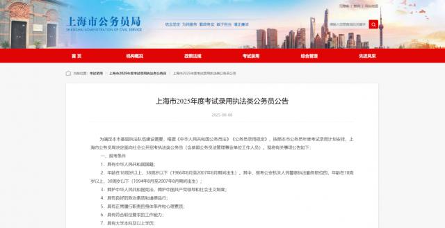 8月8日,上海市公務(wù)員局發(fā)布“上海市2025年度考試錄用執(zhí)法類公務(wù)員公告”,共計(jì)招錄1004人,其中黃浦區(qū)招錄36人(行政執(zhí)法類職位)。