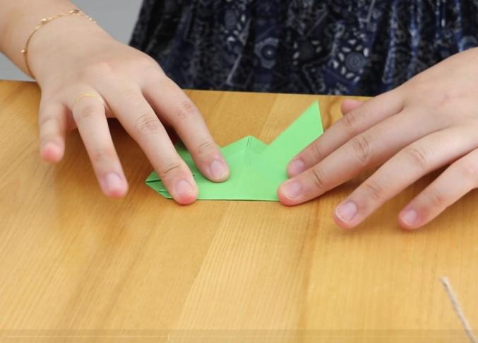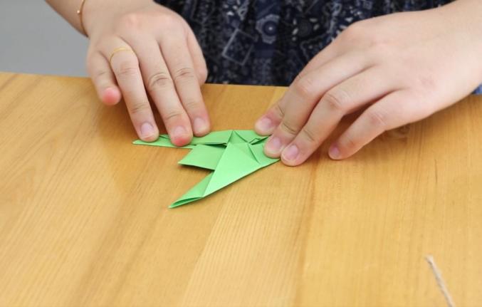 4. 把折紙翻到背面,將左右兩側(cè)對(duì)齊中縫折下,這樣蟬的雙翼就折好了。