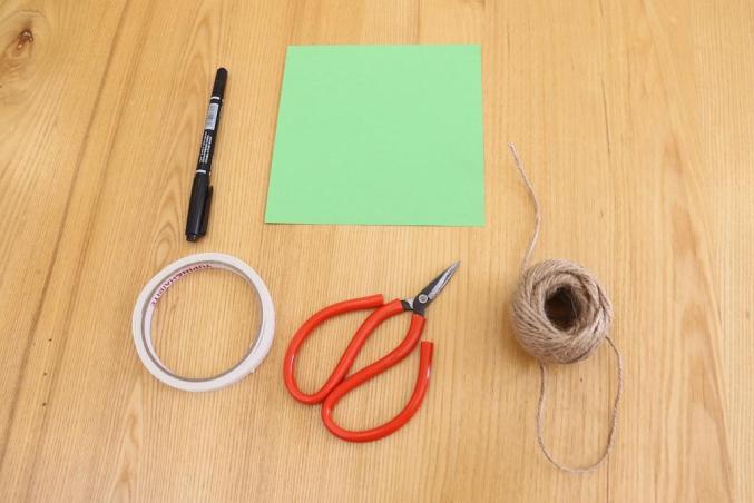 彩紙、剪刀、雙面膠、麻繩、馬克筆