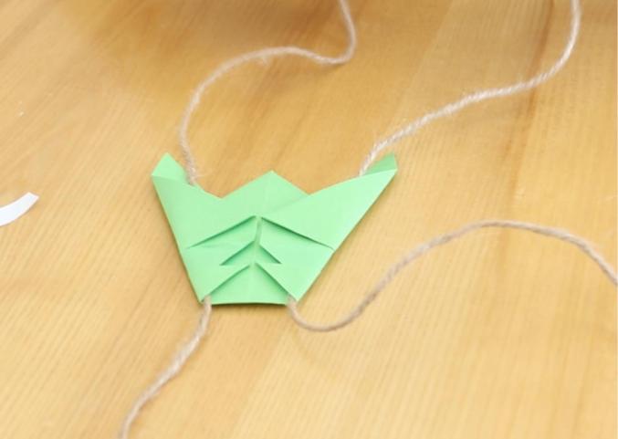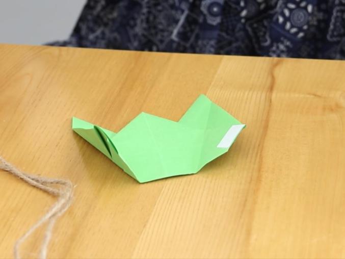 6. 剪一段麻繩,把麻繩放在蟬雙翼下面,撕開雙面膠,將雙翼折下貼好。要注意雙面膠不要貼到麻繩上,讓麻繩能保持活動(dòng)。