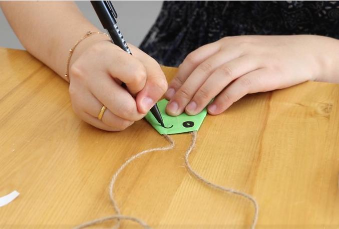 7. 在蟬下面留出的兩端麻繩上打結(jié),打成兩個(gè)小圈。