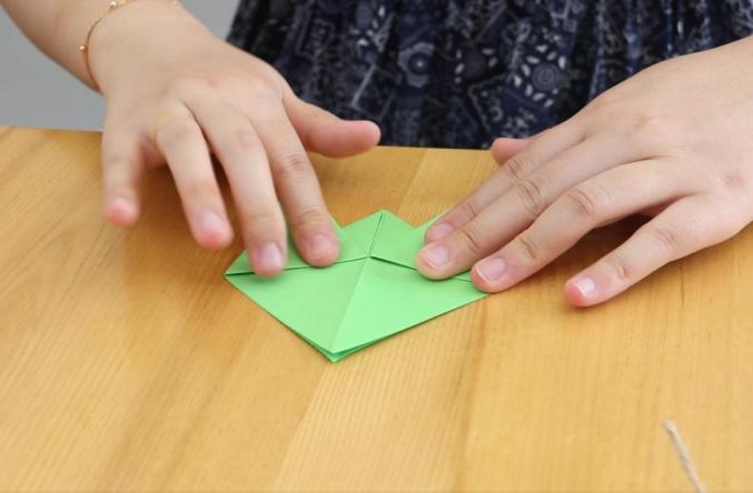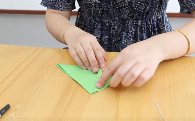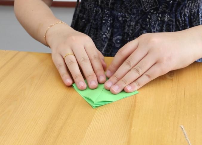 1. 先把彩紙角對(duì)角對(duì)折,接著將兩邊的角往中間折。