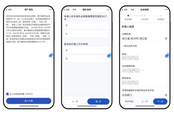 申領(lǐng)步驟(以移動(dòng)端為例):進(jìn)入辦理界面后,閱讀用戶須知,選擇具體情形,填寫信息并上傳材料,確認(rèn)信息后即完成申請(qǐng)。