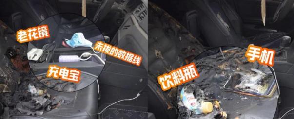 手機、平板電腦等大部分電子產(chǎn)品用的是鋰電池,在較封閉和高溫環(huán)境下很可能發(fā)生鼓包,甚至爆炸。尤其是一些采用不合格或翻新電芯的劣質(zhì)充電寶,更為危險。浙江一車主遺留在副駕駛座椅上的手機,因長時間暴曬發(fā)生了爆炸,且車內(nèi)還存在飲料瓶、充電寶、老花鏡等多種潛在“定時炸彈”。