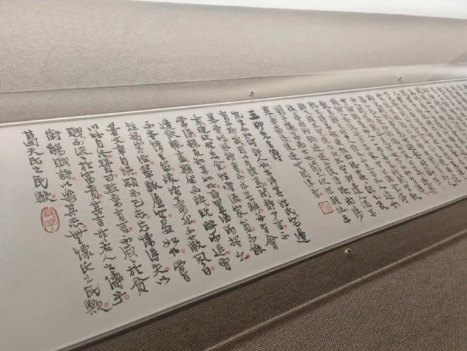 此次展覽還展出了豐子愷先生的書法作品和家書,讓人們看到他在藝術之外的另一面。他的書法作品筆筆中鋒,整體風格古樸厚重、逸趣橫生。尤其是三件首次在上海亮相的長達7.62米的手卷,書有眾多詩詞,既有《古詩十九首》、陶淵明《桃花源記》等經典作品,也有他自己創(chuàng)作的詩詞。這些手卷不僅是書法藝術的瑰寶,更展現了他對傳統(tǒng)文化的熱愛和深厚的功底。而他寫給小兒子的家書,則用中國古代文人傳統(tǒng)的書寫方式,傳遞出他對家人的關愛和牽掛,讓人感受到他作為父親的柔情與溫暖。