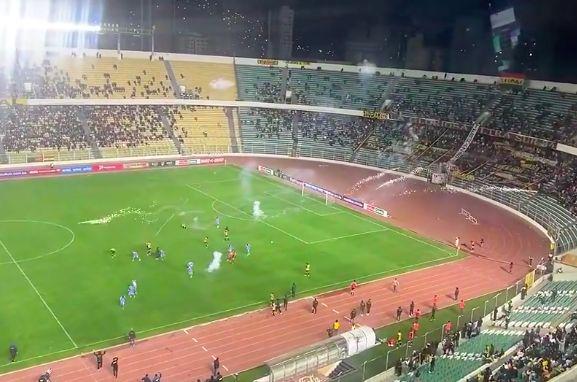 煙花從看臺上騰空而起,場面喧鬧。然而意外發(fā)生了,部分煙花沒有射向高空,而是直接飛向了球場內(nèi)。最強者的前鋒戈杜伊不幸被一個高速飛來的煙花擊中下體!