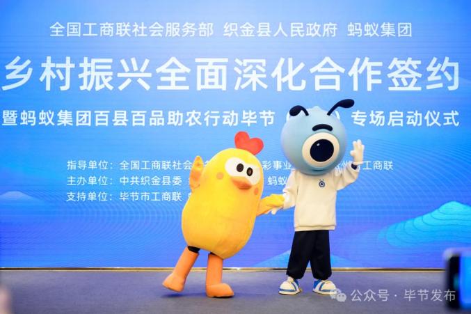2023年11月22日,螞蟻集團的IP“螞蟻”和織金縣文旅IP“宮保雞”“牽手”。當天,全國工商聯(lián)社會服務(wù)部、織金縣政府、螞蟻集團簽訂鄉(xiāng)村振興合作協(xié)議,標志著“地域+領(lǐng)域”產(chǎn)業(yè)組團式幫扶啟動,百縣百品織金品牌館也應(yīng)運而生。
