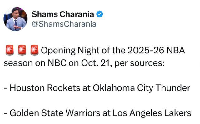 NBA安排擁有凱文 - 杜蘭特的全新陣容火箭隊(duì),在賽季揭幕日前往俄克拉荷馬城,見(jiàn)證雷霆隊(duì)的戒指頒發(fā)儀式;當(dāng)晚的壓軸戰(zhàn)則是勒布朗 - 詹姆斯與斯蒂芬 - 庫(kù)里的再度交鋒。