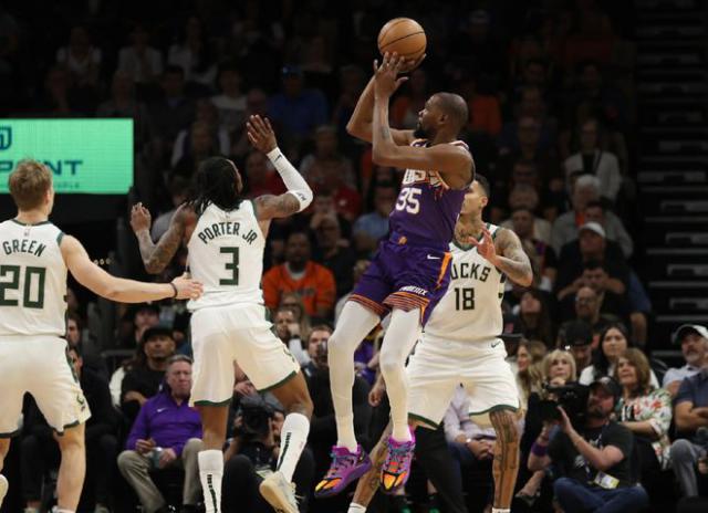 其二,在籃網(wǎng)時期,有哈登兜底。如果那年歐文不是打打停停,杜蘭特長時間養(yǎng)傷,哈登也不會在季后賽來臨時累倒。有哈登的籃網(wǎng),首輪紳士橫掃凱爾特人,次輪距離淘汰最終總冠軍雄鹿只差3厘米(杜蘭特鞋略長,踩線長兩分);當(dāng)哈登離開后,輪到杜蘭特和歐文帶隊,季后賽首輪就被凱爾特人0-4橫掃出局。還有在太陽時期,2023年被掘金淘汰,他和布克立棍單打;2024年夏天被森林狼首輪橫掃出局,上賽季甚至連附加賽都進(jìn)不去。杜蘭特作為球隊的第一或者第二得分點,既沒有起到領(lǐng)袖作用,也沒有兜底的能力。