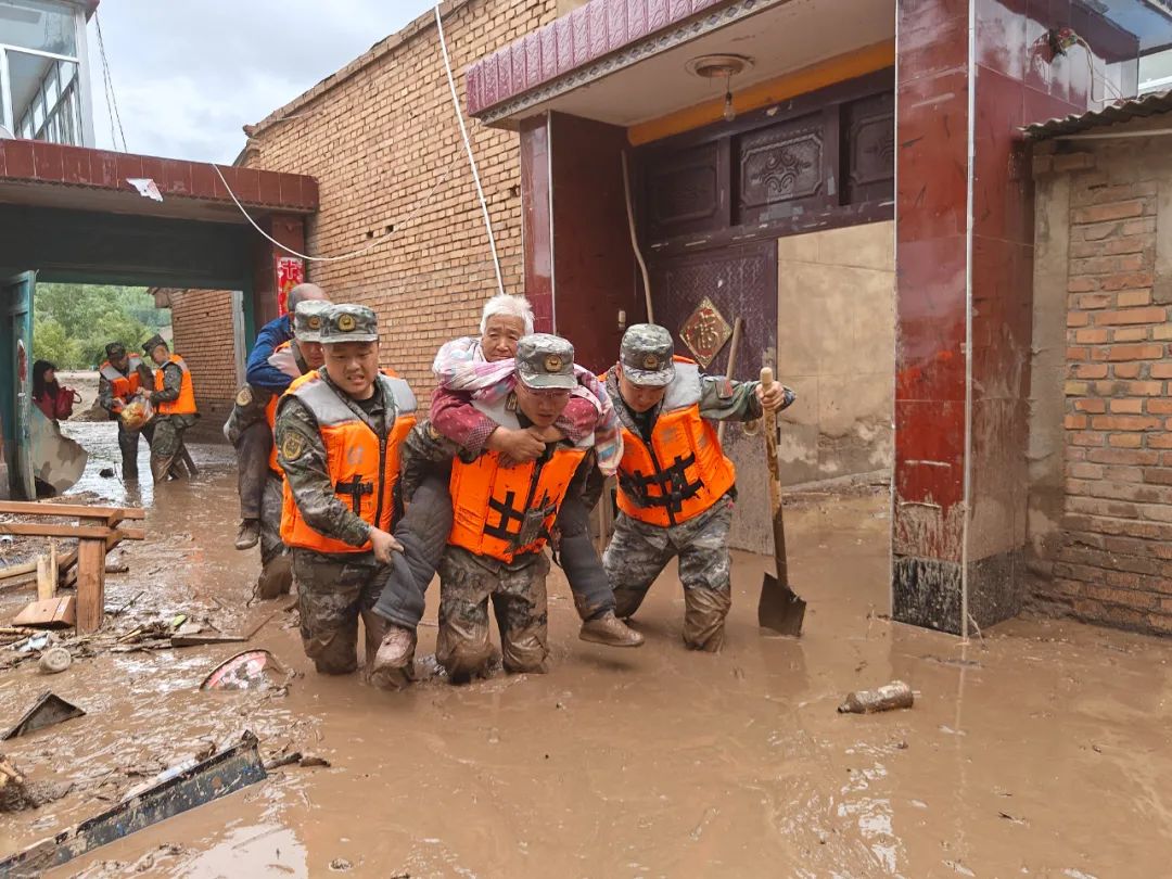 8月8日,武警甘肅總隊機動支隊官兵在蘭州市榆中縣城關(guān)鎮(zhèn)興隆山村轉(zhuǎn)移被困群眾。