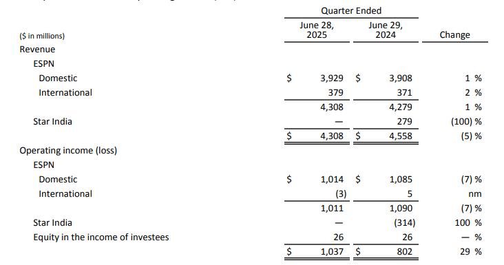 體育板塊主要是ESPN(娛樂體育節(jié)目電視網(wǎng),Entertainment and Sports Programming Network),本季度運(yùn)營利潤大幅增長29%,主要是由于甩掉了虧損的印度業(yè)務(wù)Star India。