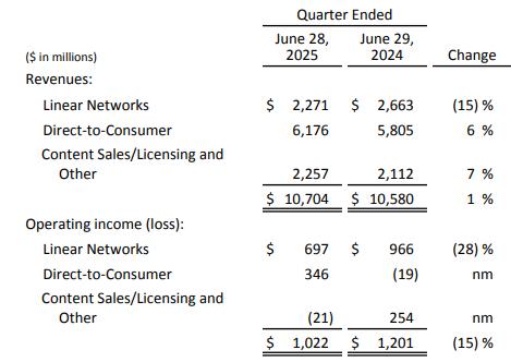 其中娛樂板塊包含流媒體、電視網(wǎng)絡(luò)和內(nèi)容發(fā)行與授權(quán),本季度運(yùn)營利潤同比下滑15%。