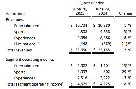 目前迪士尼的業(yè)務(wù)分為娛樂、體育、體驗(yàn)三個(gè)板塊,截至6月28日的季度收入分別為107.04億、43.08億、90.86億美元,運(yùn)營利潤分別為10.22億、10.37億、25.16億美元。