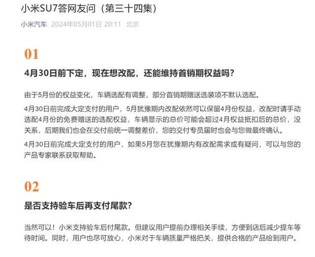 小米汽車曾在答網(wǎng)友問(wèn)中明確表示支持驗(yàn)車后再付尾款