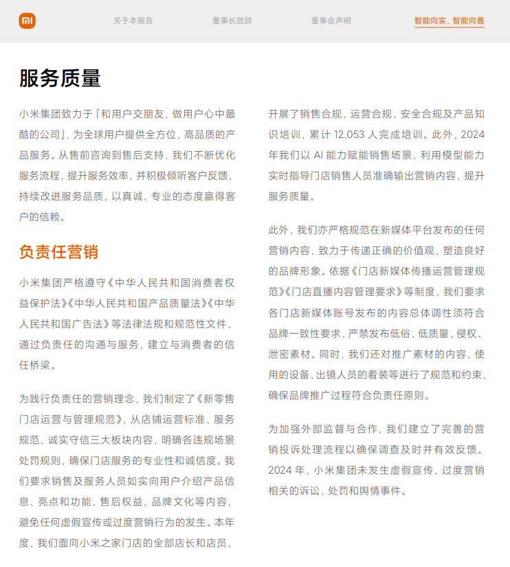 在小米2024年的ESG報(bào)告中,有這樣一段話:“我們不斷優(yōu)化全方位的服務(wù)體系,始終為消費(fèi)者提供可信、貼心的服務(wù)體驗(yàn),堅(jiān)守「與用戶交朋友」的初心。”但從目前小米汽車的爭(zhēng)議來(lái)看,小米在S(社會(huì))與G(治理)層面還有優(yōu)化空間。