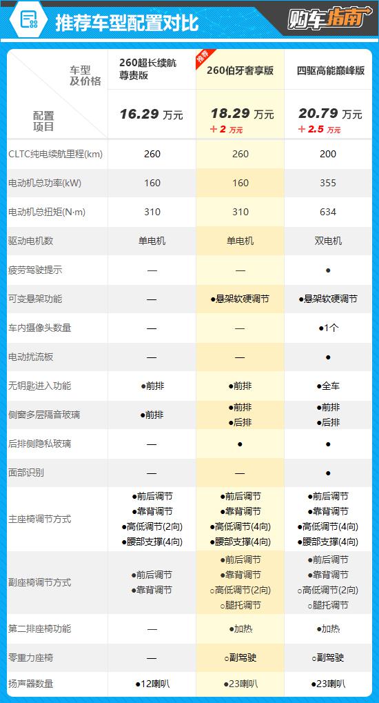 與四驅(qū)高能巔峰版相比,推薦車型在疲勞駕駛提示、車內(nèi)攝像頭數(shù)量、面部識(shí)別等安全科技配置上稍有不足,但這些功能日常使用中存在感低,對(duì)用車體驗(yàn)提升有限。此外,四驅(qū)高能巔峰版動(dòng)力更強(qiáng)且有電動(dòng)擾流板,但該級(jí)別用戶更看重舒適性配置。而且CLTC純電續(xù)航里程縮水,考慮2.5萬(wàn)元差價(jià),推薦車型更符合主流消費(fèi)者需求。