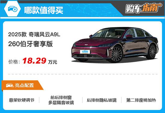 奇瑞風(fēng)云A9L的入門車型260超長(zhǎng)續(xù)航豪華版,售價(jià)14.99萬(wàn)元,配置較豐富,有電動(dòng)后備廂、前排側(cè)窗多層隔音玻璃、仿皮座椅、前排座椅加熱、8揚(yáng)聲器、自動(dòng)空調(diào)、前排中間氣囊以及哨兵模式/千里眼等功能,能滿足日常使用。但配置水平與旗艦定位有差距,對(duì)乘客舒適照顧不足,性價(jià)比略低,不做重點(diǎn)推薦。