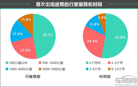 出現(xiàn)非人為故障的車輛中,首次故障出現(xiàn)在行駛里程500公里以內(nèi)的占比最高,為47.1%。52.9%的車主表示車輛購(gòu)車1個(gè)月內(nèi)就出現(xiàn)故障。