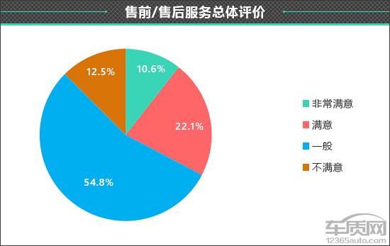 售前/售后服務(wù)總體評(píng)價(jià)中,車主評(píng)價(jià)客觀,10.6%的車主“非常滿意”,22.1%的車主“滿意”,54.8%的車主評(píng)價(jià)“一般”,12.5%的車主“不滿意”。