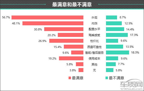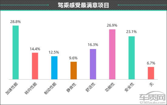 進(jìn)一步調(diào)查針對(duì)加速性能、轉(zhuǎn)向性能、制動(dòng)性能、靜音性、舒適性、功能性和安全性7個(gè)方面進(jìn)行駕乘感受滿意度調(diào)查。多數(shù)車主對(duì)“加速性能”和“功能性”評(píng)價(jià)較高。不滿意主要集中在靜音性方面,受造型影響,部分車主反映車輛行駛時(shí)風(fēng)噪明顯。