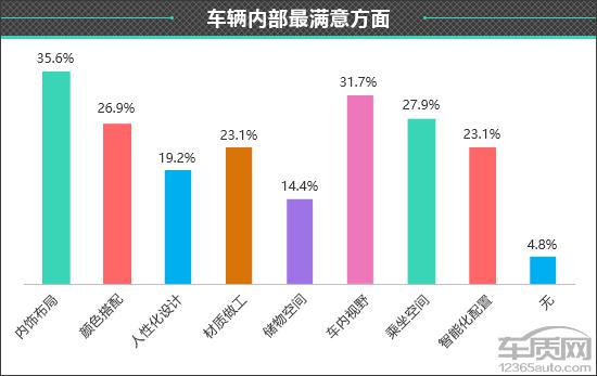 內(nèi)部情況調(diào)查中,35.6%的車主肯定“內(nèi)飾布局”?!败噧?nèi)視野”“乘坐空間”和“顏色搭配”也獲廣泛認(rèn)可,占比分別為31.7%、27.9%和26.9%。